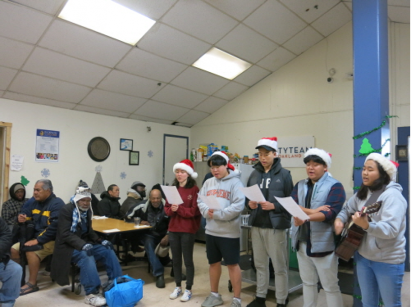 식사서브에 앞서 오클랜드 피스토스교회(조영구 목사 시무)청년들로 구성된 자원봉사자들은 크리스 마스 캐롤과 정하영씨의 성탄의 기쁨이 거리에서 어렵게 살아가고 있는 노숙자에게도 함께 해줄것을 간구하는 기도가 있었다.