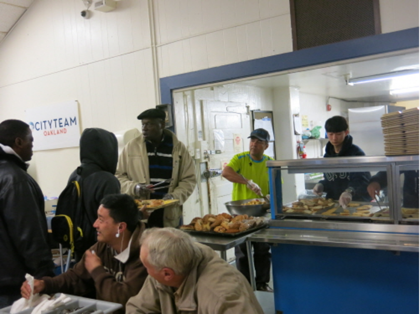 작은나눔의 봉사자들이 19일 오클랜드 시티팀에서 노숙자에게 추수감사절 음식을 서브하며 감사의 기쁨을 나누고 있다.